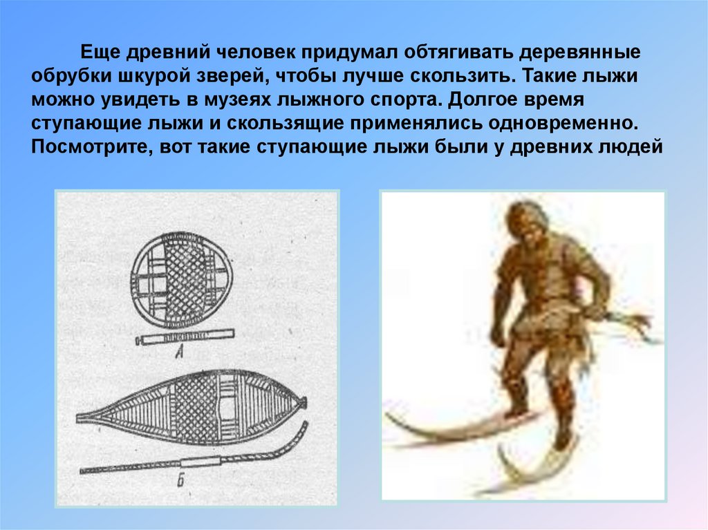 Еще древний человек придумал обтягивать деревянныеобрубки шкурой зверей, чтобы лучше скользить. Такие лыжи