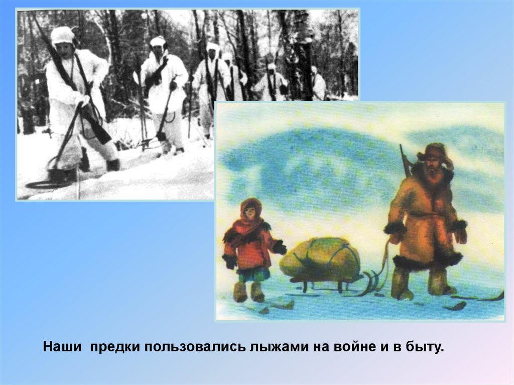 Наши предки пользовались лыжами на войне и в быту.8.