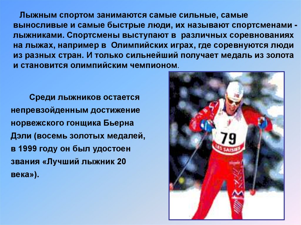 Лыжным спортом занимаются самые сильные, самыевыносливые и самые быстрые люди, их называют спортсменами лыжниками. Спортсмены выступают в различных соревнованиях