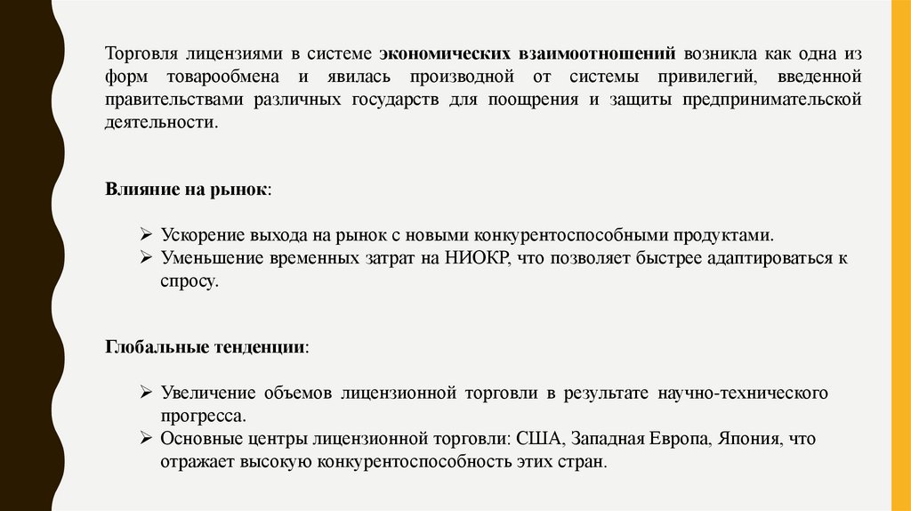 Торговля лицензиями в системе экономических взаимоотношений возникла как одна изформ товарообмена и явилась производной от системы привилегий, введенной