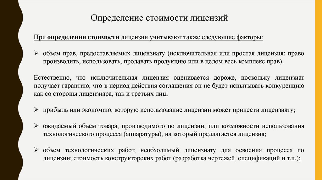 Определение стоимости лицензийПри определении стоимости лицензии учитывают также следующие факторы: