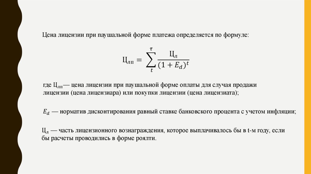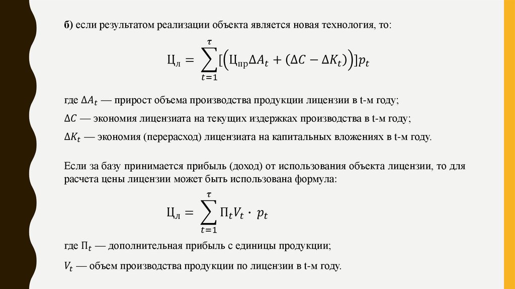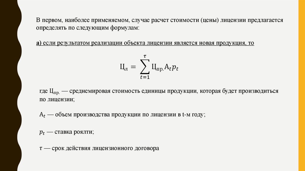 В первом, наиболее применяемом, случае расчет стоимости (цены) лицензии предлагаетсяопределять по следующим формулам: