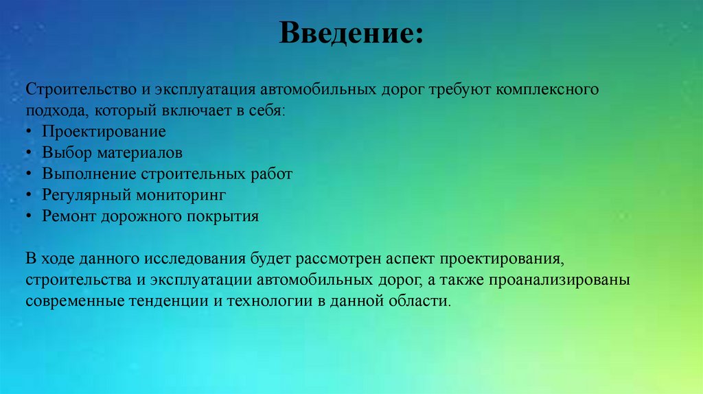Введение:Строительство и эксплуатация автомобильных дорог требуют комплексного