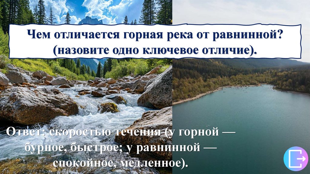 Чем отличается горная река от равнинной?(назовите одно ключевое отличие).