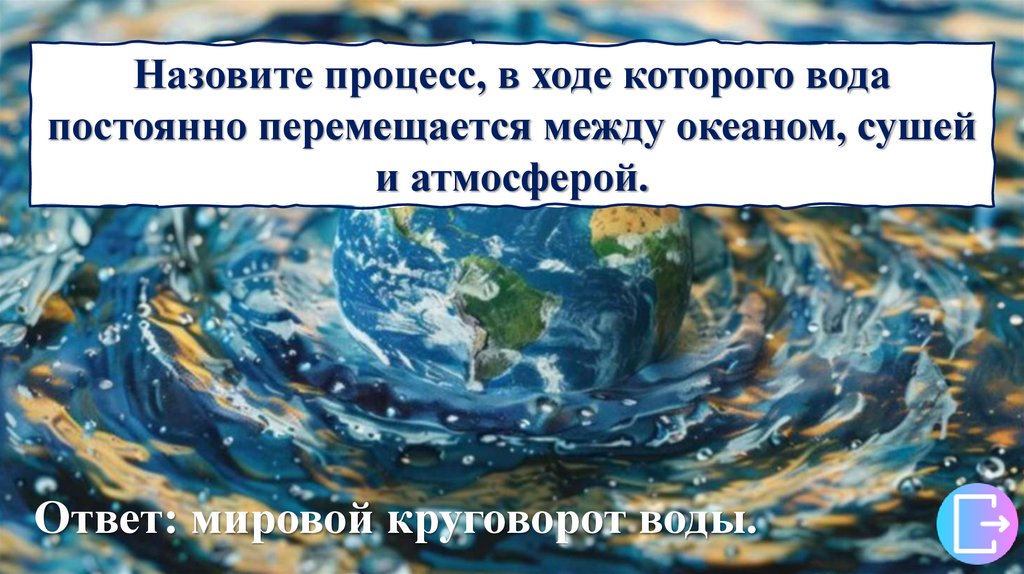 Назовите процесс, в ходе которого водапостоянно перемещается между океаном, сушей