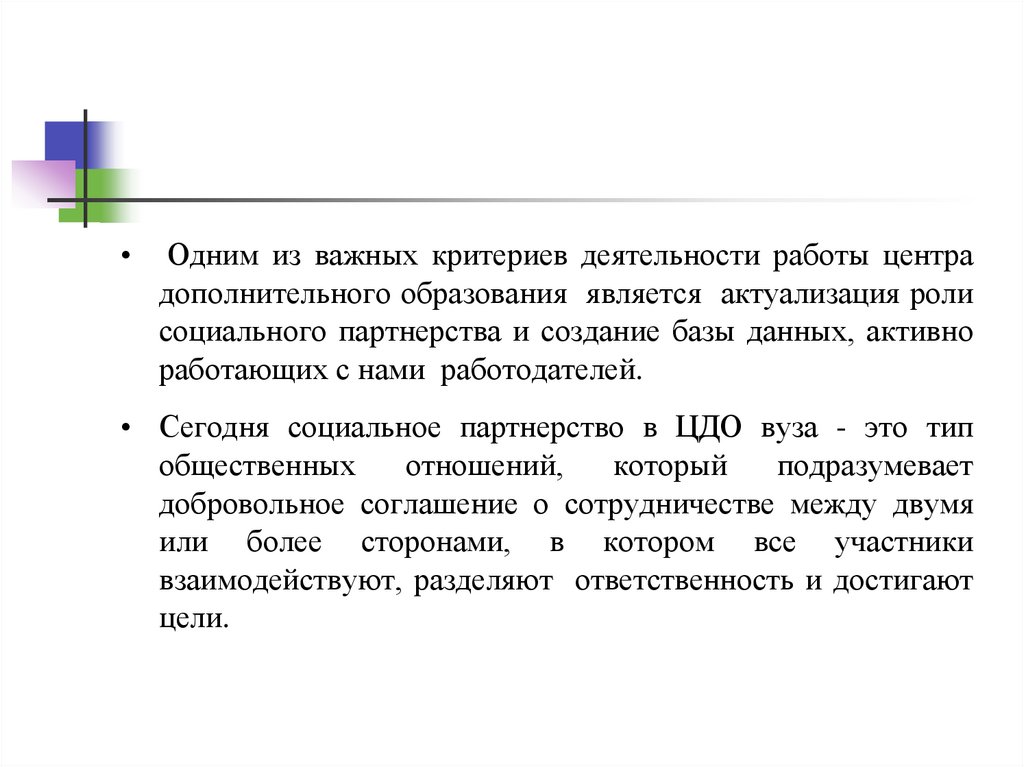 • Сегодня социальное партнерство в ЦДО вуза - это тип