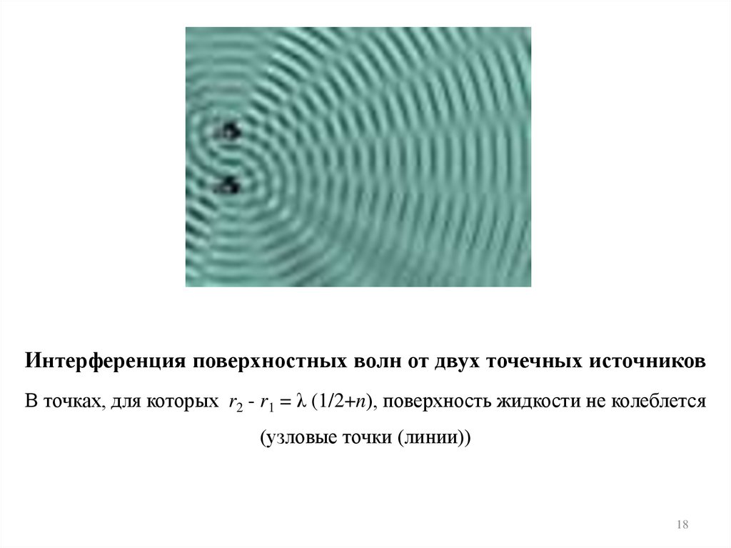 Интерференция поверхностных волн от двух точечных источниковВ точках, для которых r2 - r1 = λ (1/2+n), поверхность жидкости не колеблется