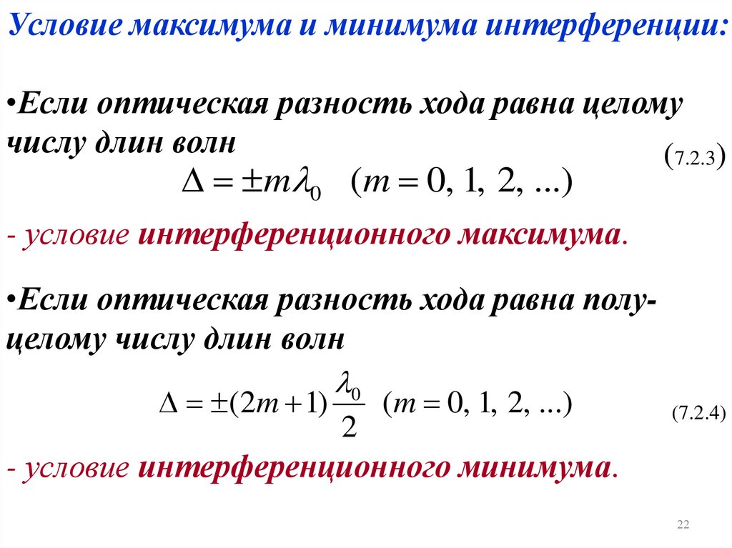 Условие максимума и минимума интерференции:•Если оптическая разность хода равна целому