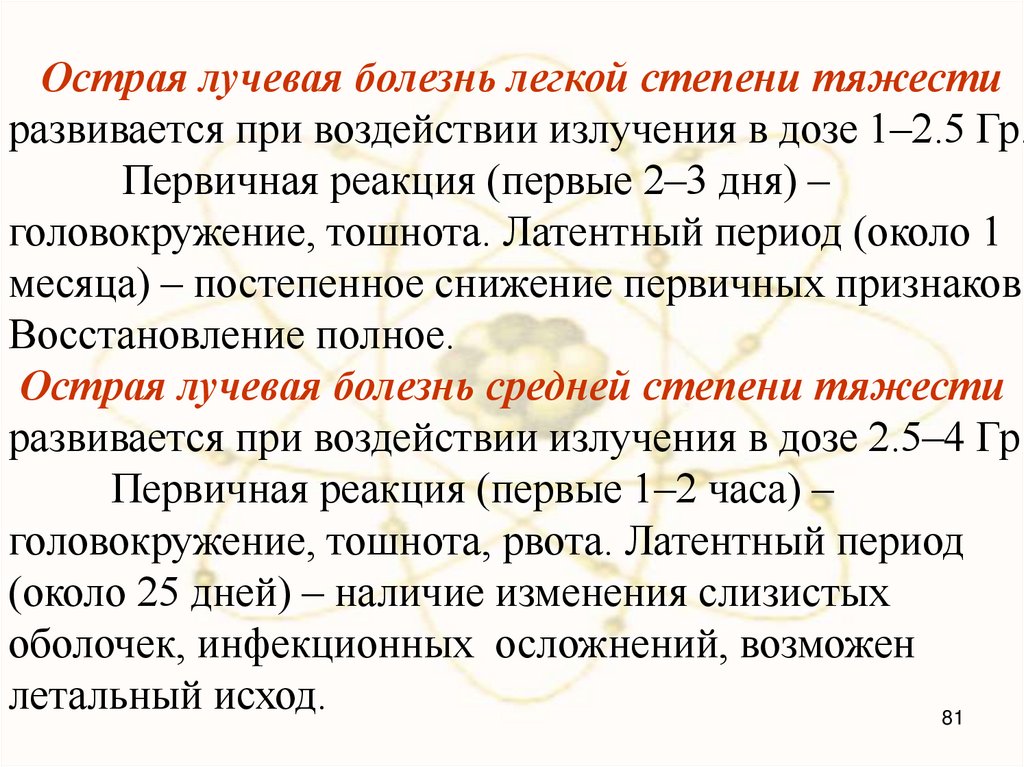 Острая лучевая болезнь легкой степени тяжестиразвивается при воздействии излучения в дозе 1–2.5 Гр.