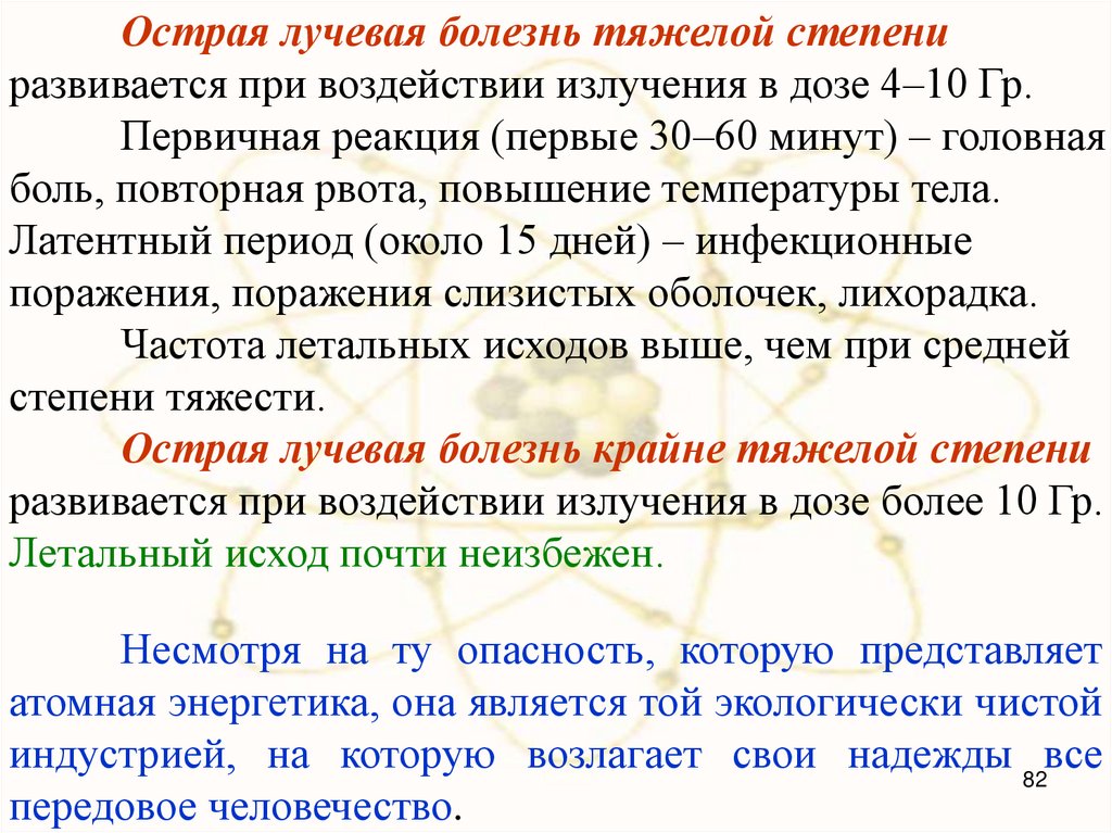 Острая лучевая болезнь тяжелой степениразвивается при воздействии излучения в дозе 4–10 Гр.