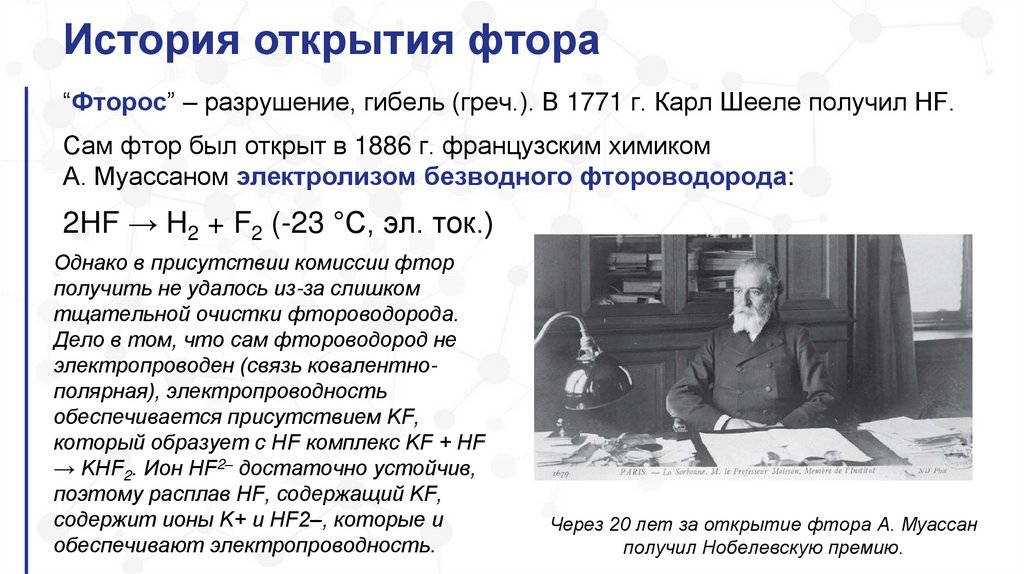 История открытия фтора“Фторос” – разрушение, гибель (греч.). В 1771 г. Карл Шееле получил HF.