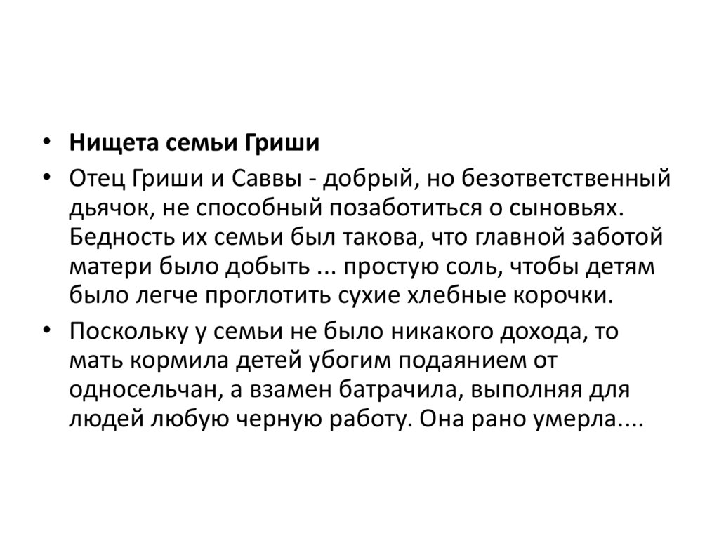 • Нищета семьи Гриши• Отец Гриши и Саввы - добрый, но безответственный