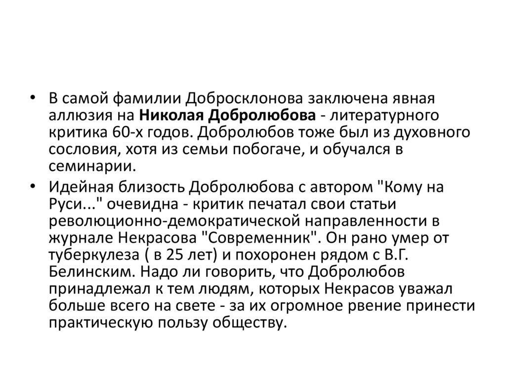 • В самой фамилии Добросклонова заключена явнаяаллюзия на Николая Добролюбова - литературного