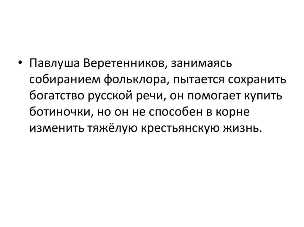 • Павлуша Веретенников, занимаясьсобиранием фольклора, пытается сохранить
