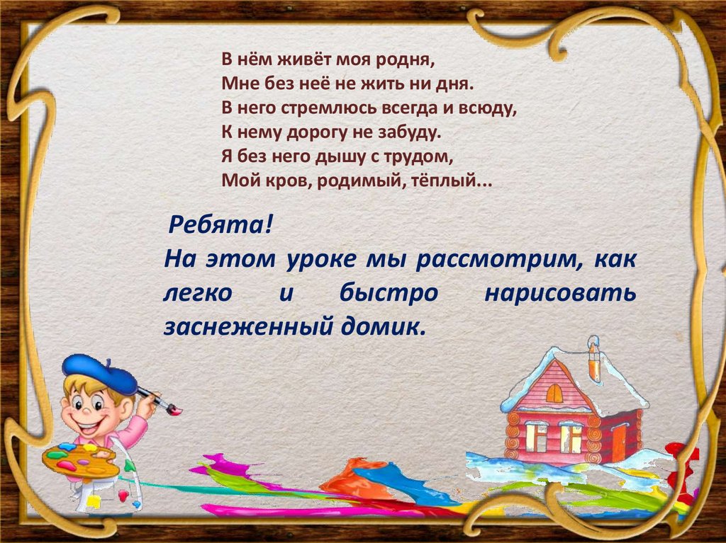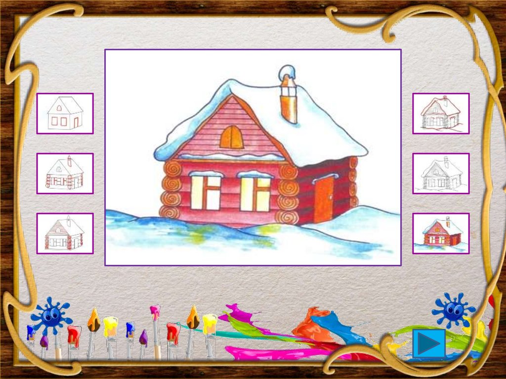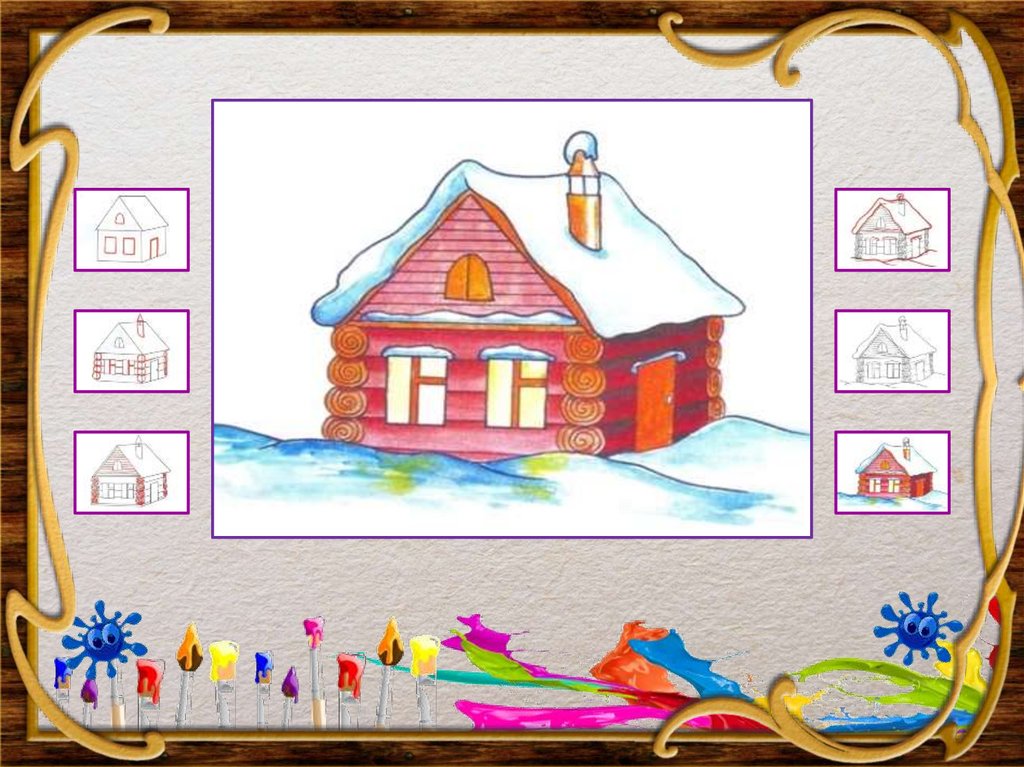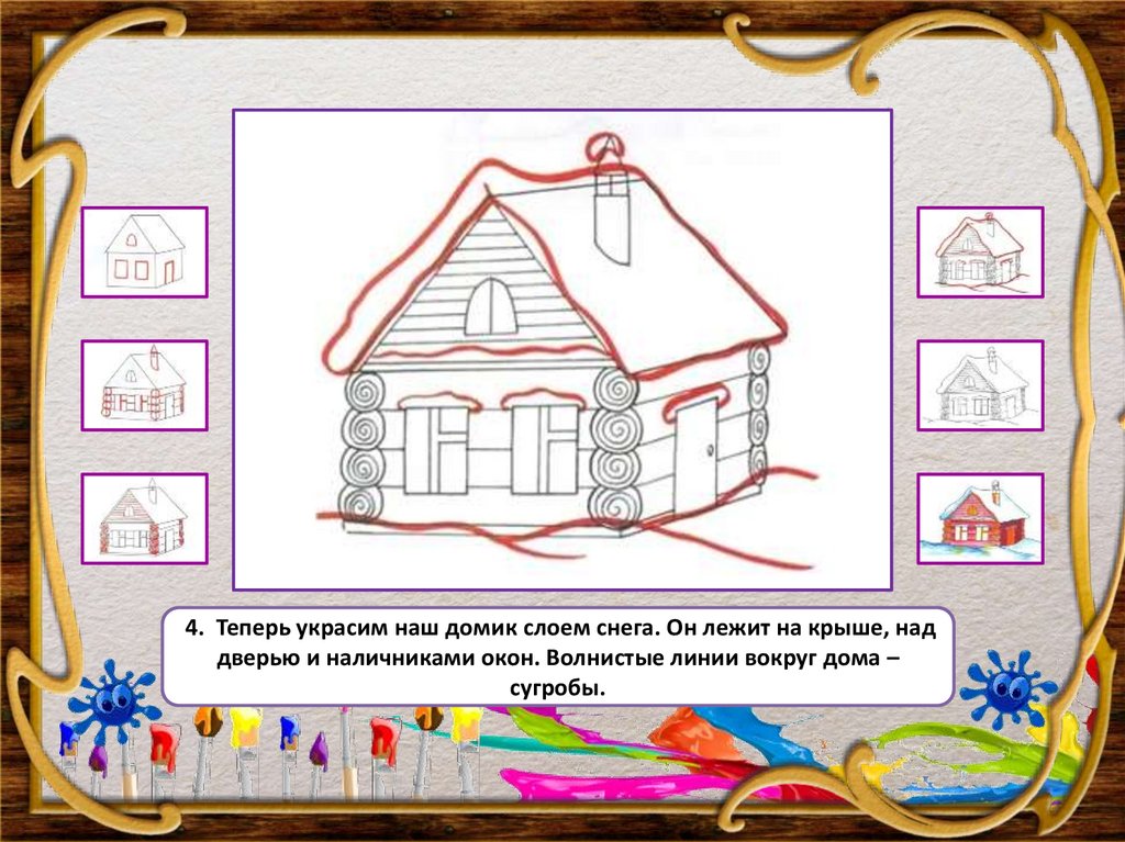 4. Теперь украсим наш домик слоем снега. Он лежит на крыше, наддверью и наличниками окон. Волнистые линии вокруг дома –