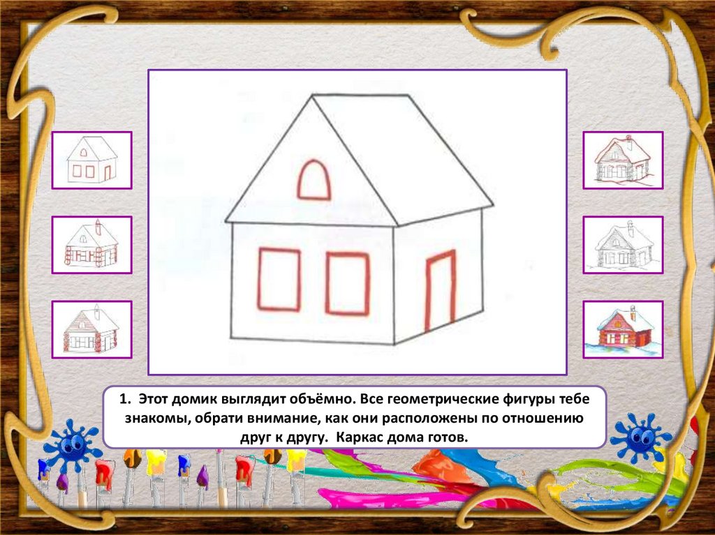 1. Этот домик выглядит объёмно. Все геометрические фигуры тебезнакомы, обрати внимание, как они расположены по отношению