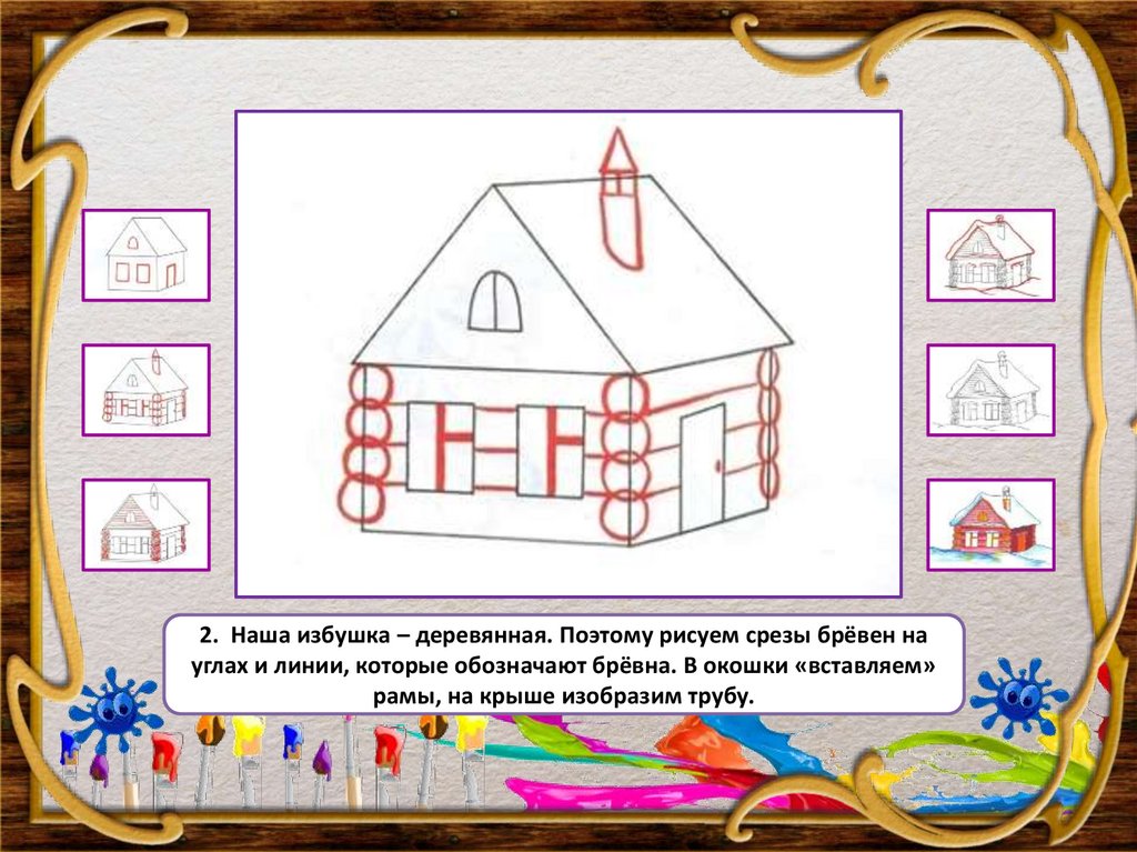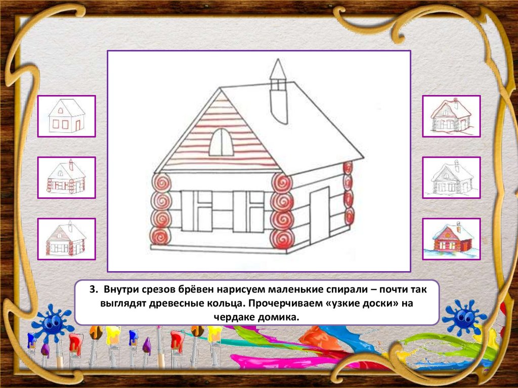 2. Наша избушка – деревянная. Поэтому рисуем срезы брёвен науглах и линии, которые обозначают брёвна. В окошки «вставляем»