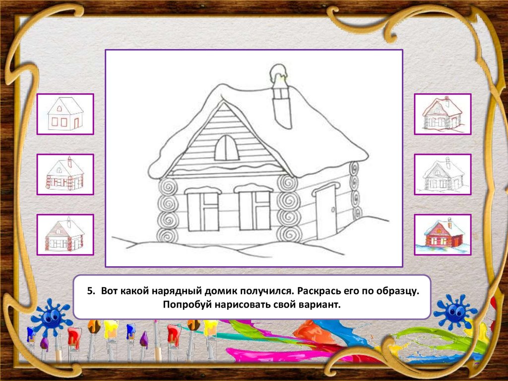 5. Вот какой нарядный домик получился. Раскрась его по образцу.Попробуй нарисовать свой вариант.