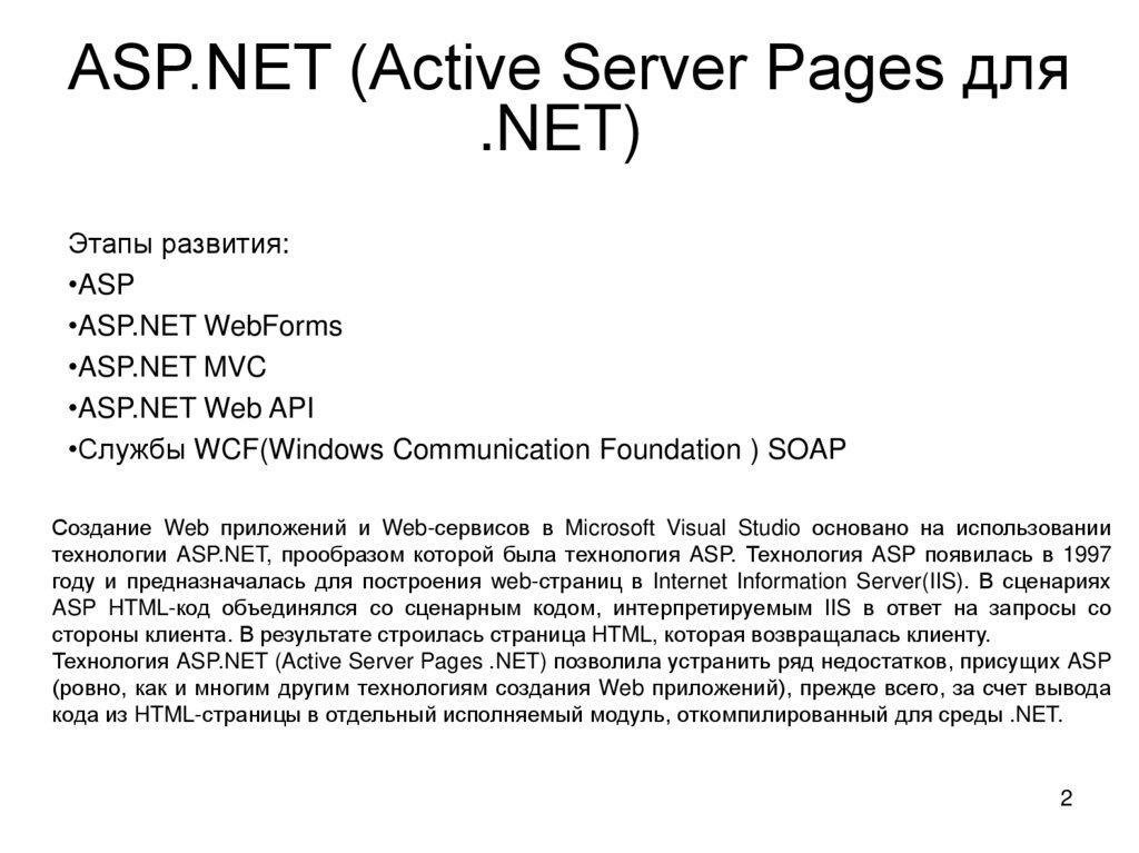 Технология ASP.NET (Active Server Pages .NET) позволила устранить ряд недостатков, присущих ASP