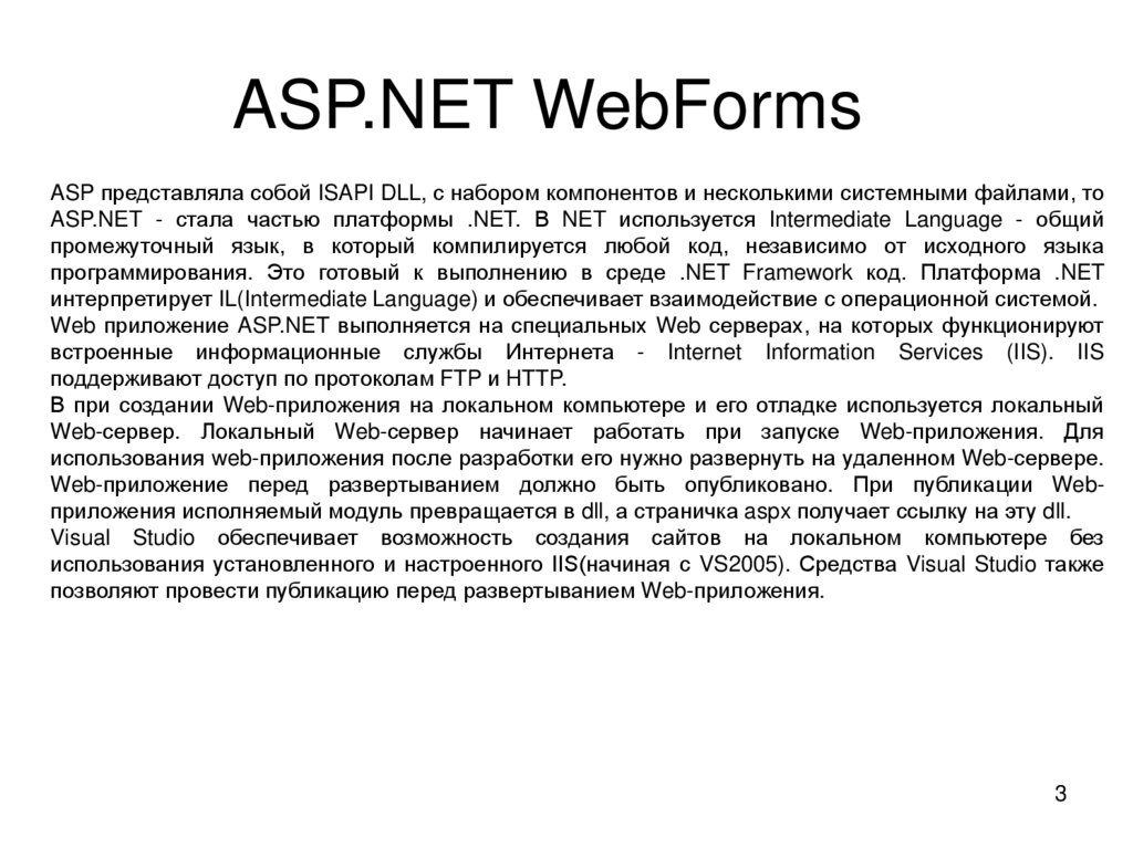 ASP.NET WebFormsASP представляла собой ISAPI DLL, с набором компонентов и несколькими системными файлами, то