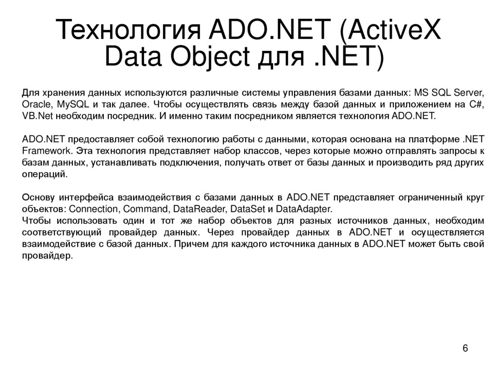 объектов: Connection, Command, DataReader, DataSet и DataAdapter.