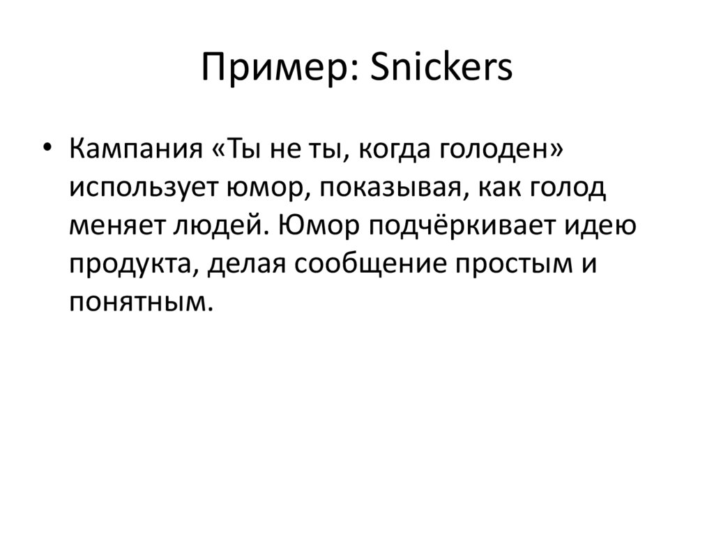 Пример: Snickers• Кампания «Ты не ты, когда голоден»