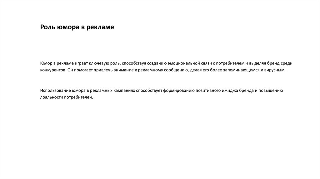 Роль юмора в рекламеЮмор в рекламе играет ключевую роль, способствуя созданию эмоциональной связи с потребителем и выделяя бренд среди