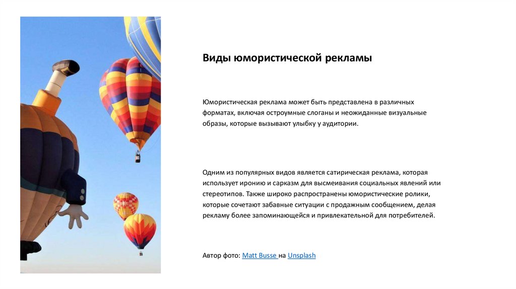Виды юмористической рекламыЮмористическая реклама может быть представлена в различных