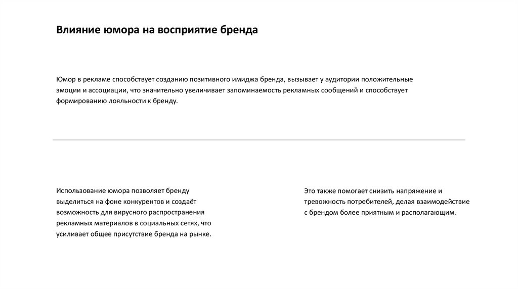 Влияние юмора на восприятие брендаЮмор в рекламе способствует созданию позитивного имиджа бренда, вызывает у аудитории положительные