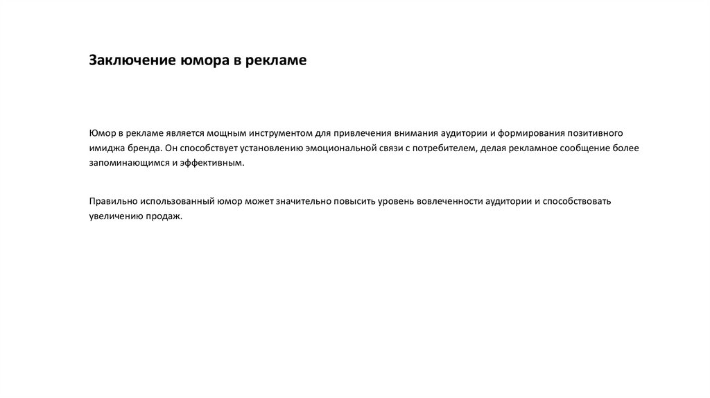 Заключение юмора в рекламеЮмор в рекламе является мощным инструментом для привлечения внимания аудитории и формирования позитивного