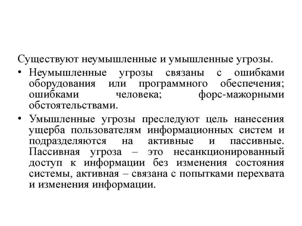 Существуют неумышленные и умышленные угрозы.• Неумышленные угрозы связаны с ошибками