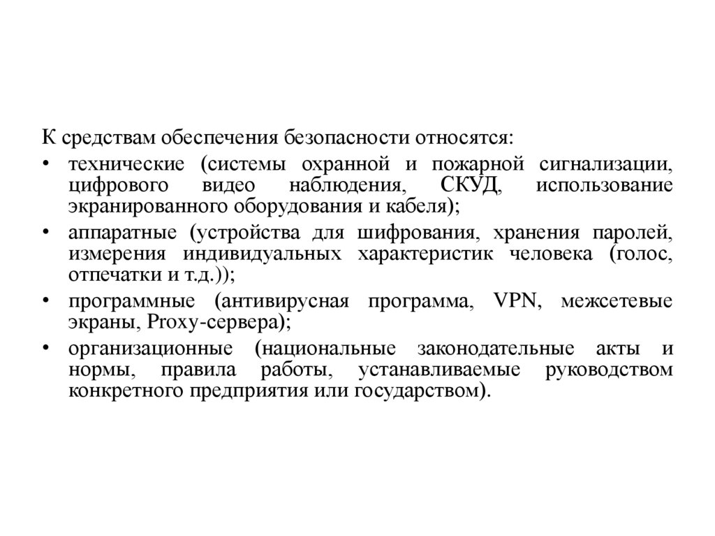 К средствам обеспечения безопасности относятся:• технические (системы охранной и пожарной сигнализации,