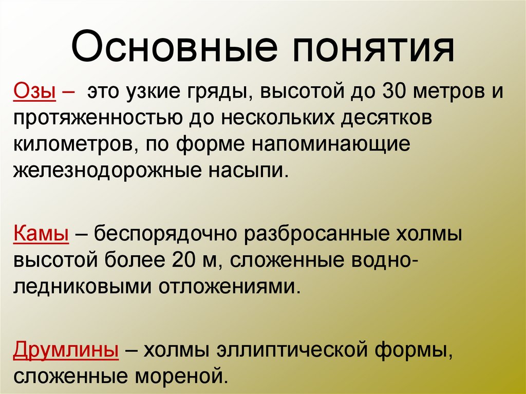 Основные понятияОзы – это узкие гряды, высотой до 30 метров и