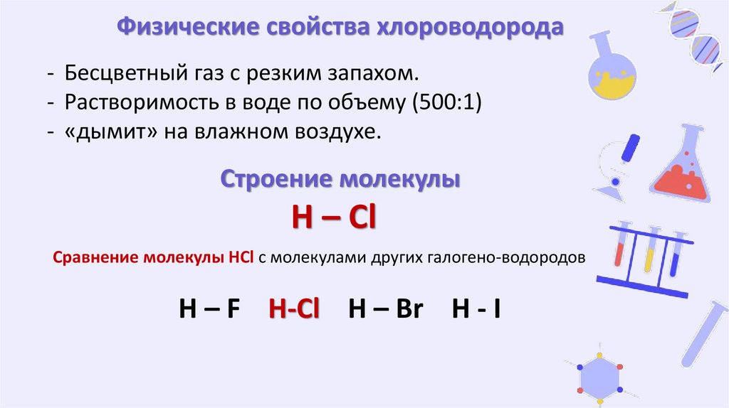 Физические свойства хлороводорода- Бесцветный газ с резким запахом.