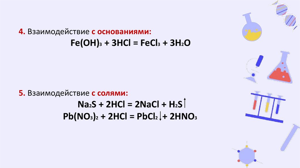 4. Взаимодействие с основаниями:Fe(OH)3 + 3HCl = FeCl3 + 3H2O
