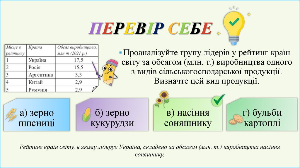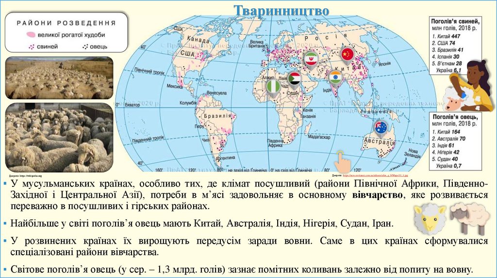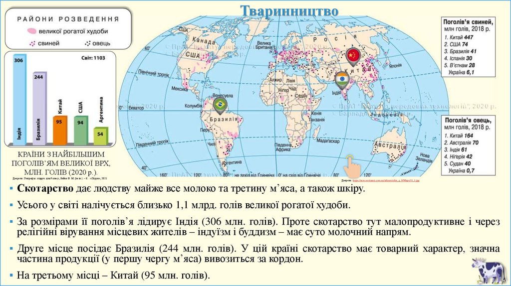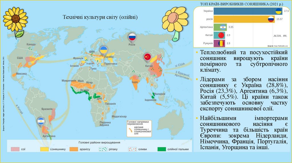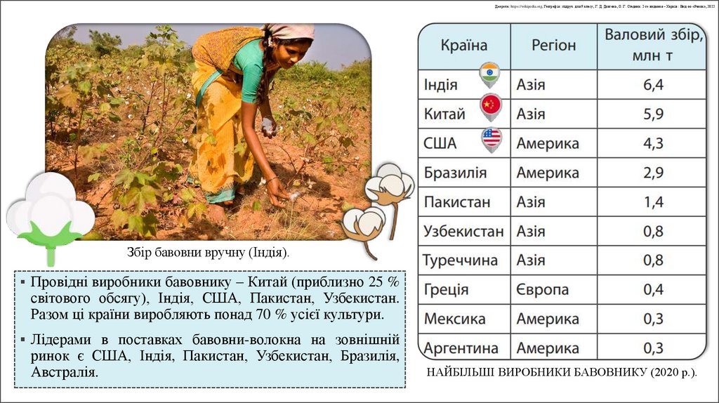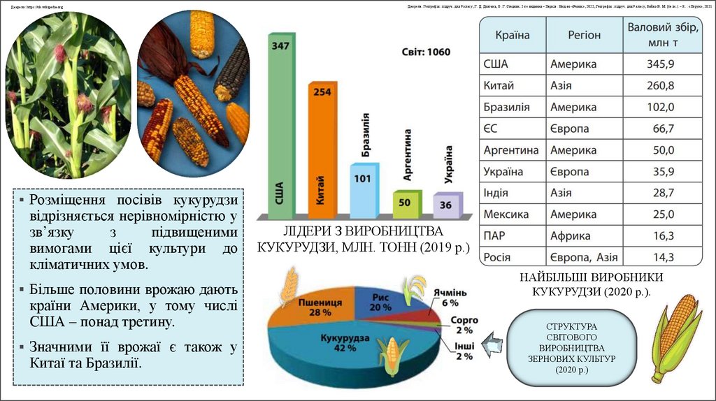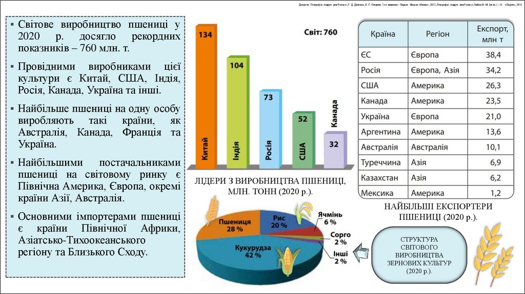 Джерела: Географія : підруч. для 9 класу, Г. Д. Довгань, О. Г. Стадник. 2-ге видання – Харків : Вид-во «Ранок», 2022, Географія : підруч. для 9 класу, Бойко В. М. [та ін.]. – К. : «Перун», 2021Світове виробництво пшениці у