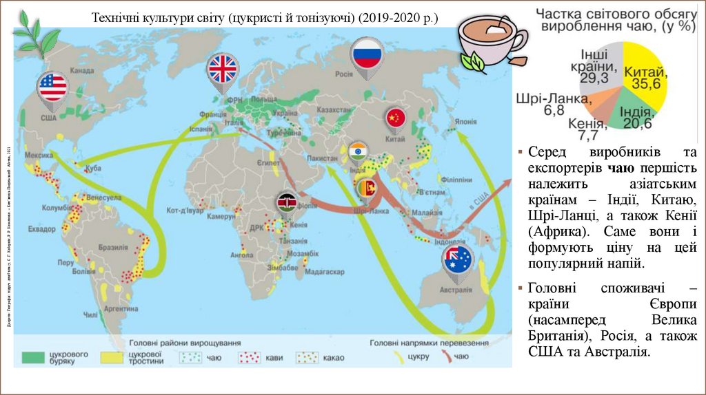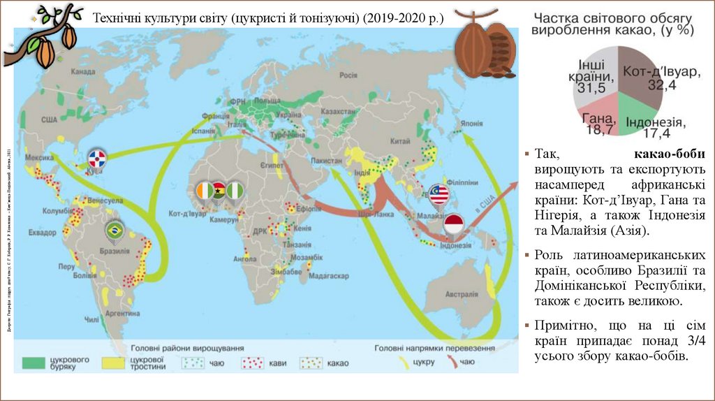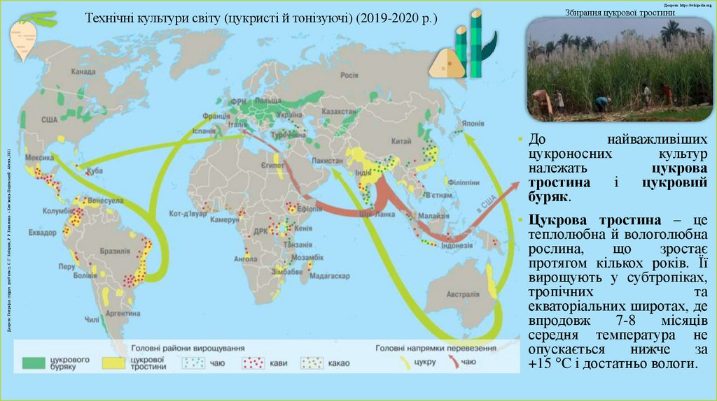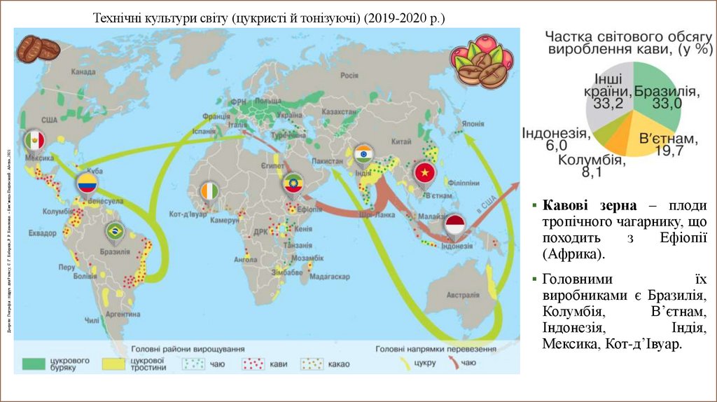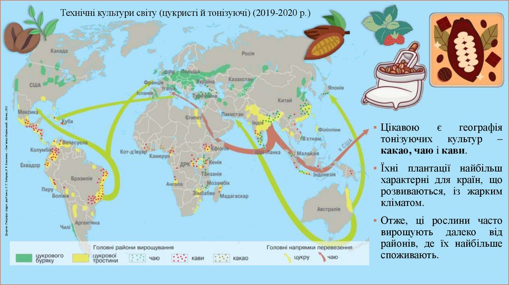 Технічні культури світу (цукристі й тонізуючі) (2019-2020 р.)Джерело: Географія : підруч. для 9 класу, С. Г. Кобернік, Р. Р. Коваленко. – Кам’янець-Подільський : Абетка, 2021