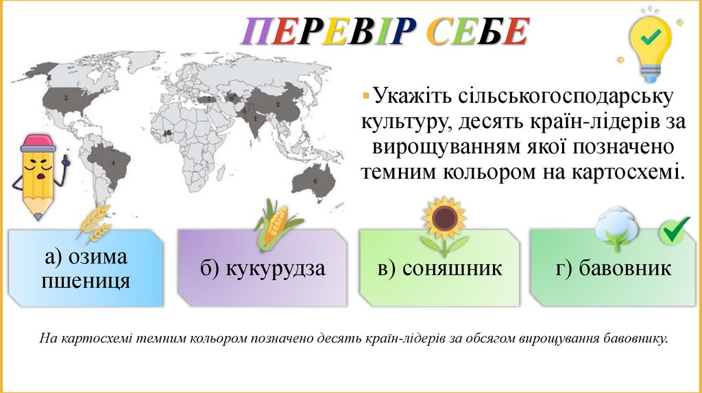 основних культур, що вирощують в світі. Заповніть таблицю.