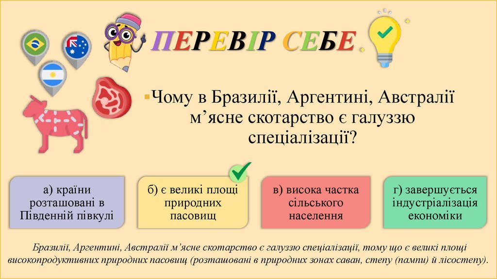 Бразилії, Аргентині, Австралії м’ясне скотарство є галуззю спеціалізації, тому що є великі площі