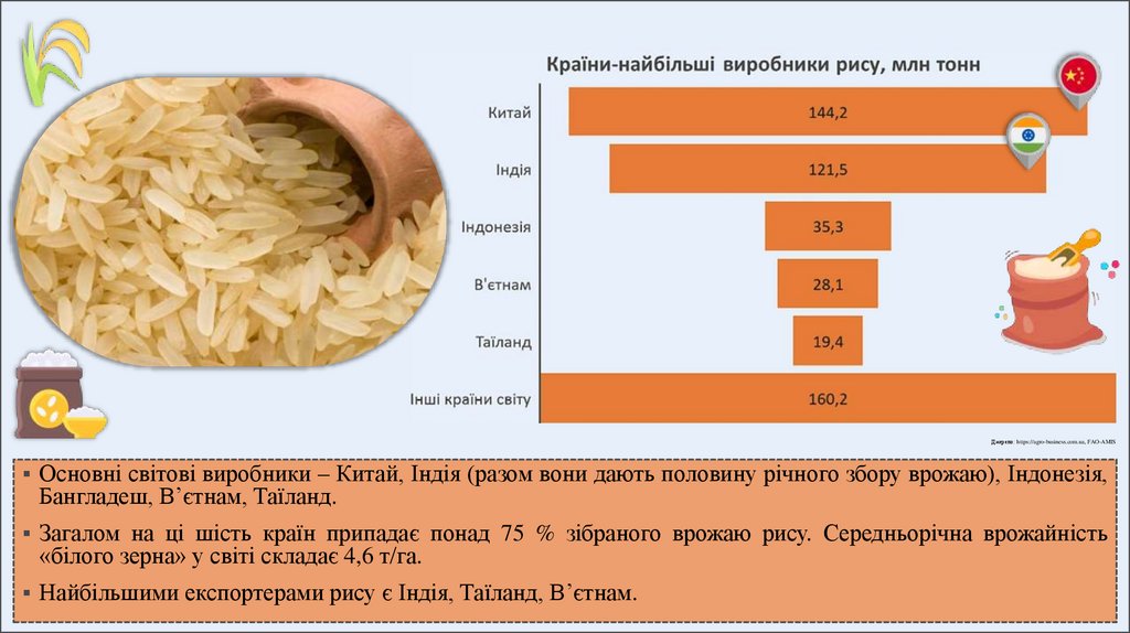 Джерело: https://agro-business.com.ua, FAO-AMISОсновні світові виробники – Китай, Індія (разом вони дають половину річного збору врожаю), Індонезія,