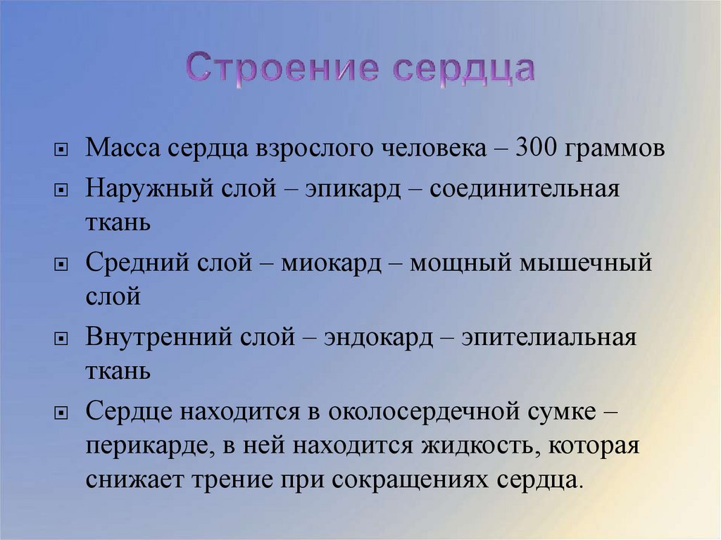 Масса сердца взрослого человека – 300 граммовНаружный слой – эпикард – соединительная