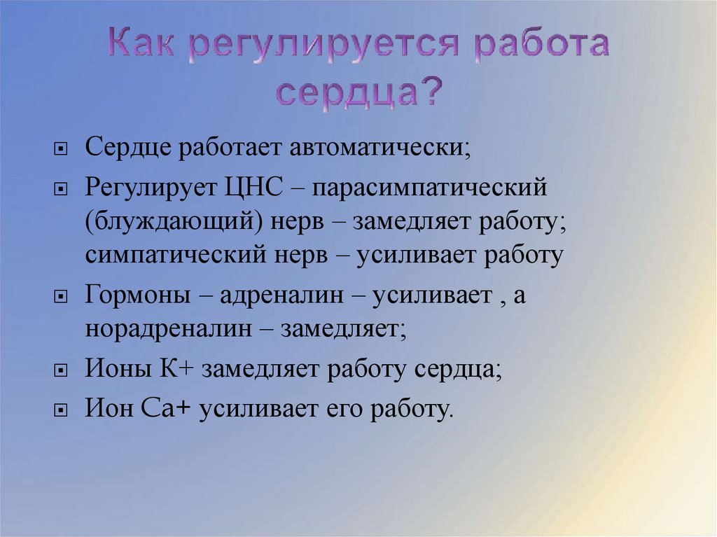 Сердце работает автоматически;Регулирует ЦНС – парасимпатический