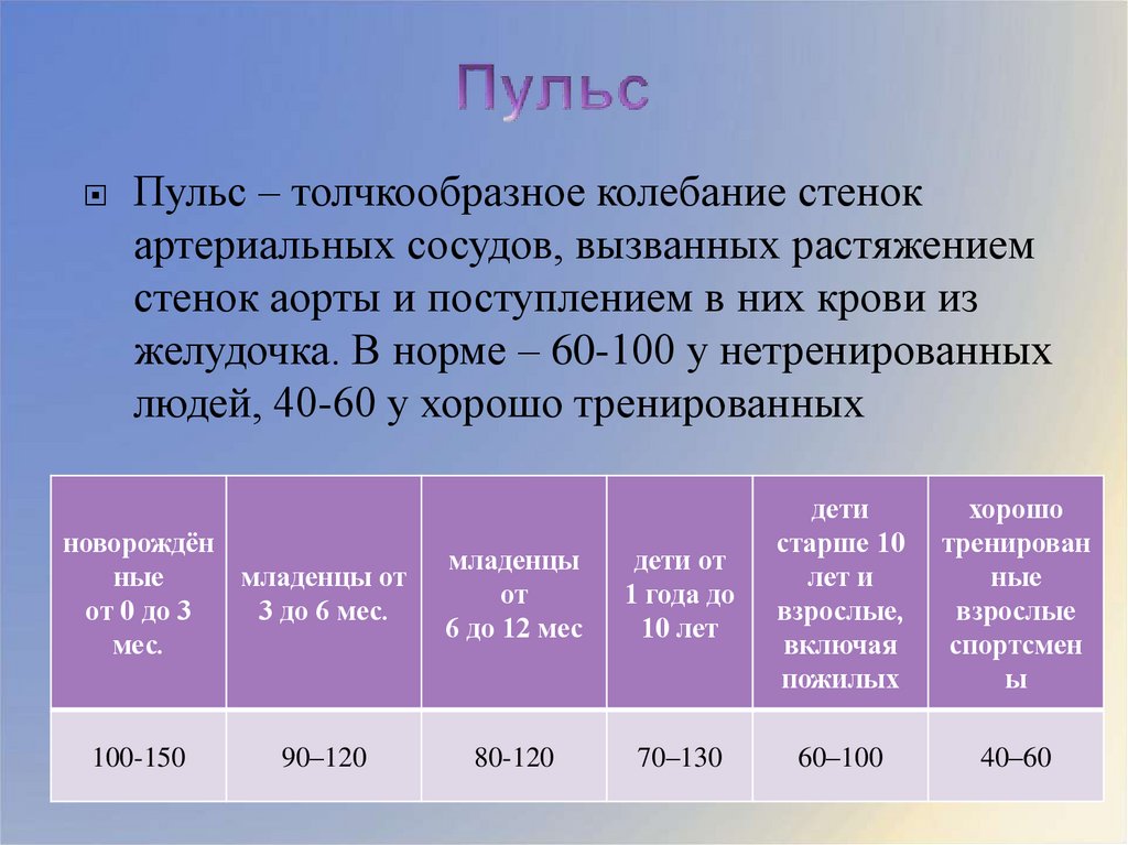 Пульс – толчкообразное колебание стенокартериальных сосудов, вызванных растяжением