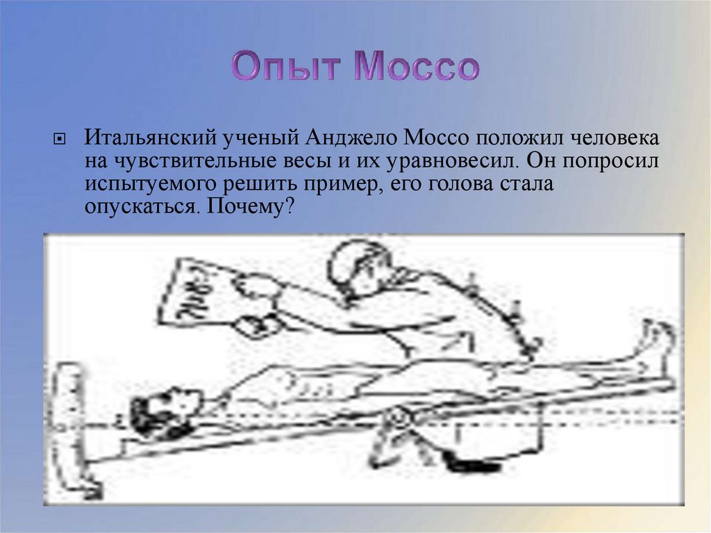 Итальянский ученый Анджело Моссо положил человекана чувствительные весы и их уравновесил. Он попросил