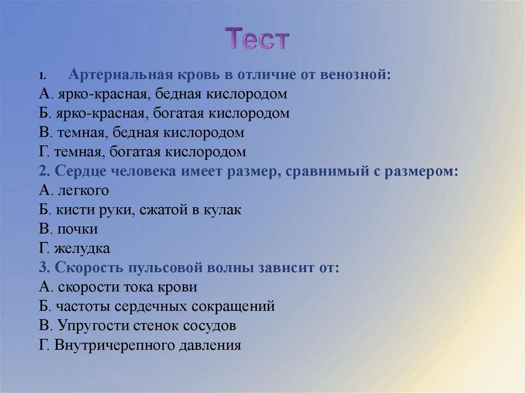 Артериальная кровь в отличие от венозной:А. ярко-красная, бедная кислородом