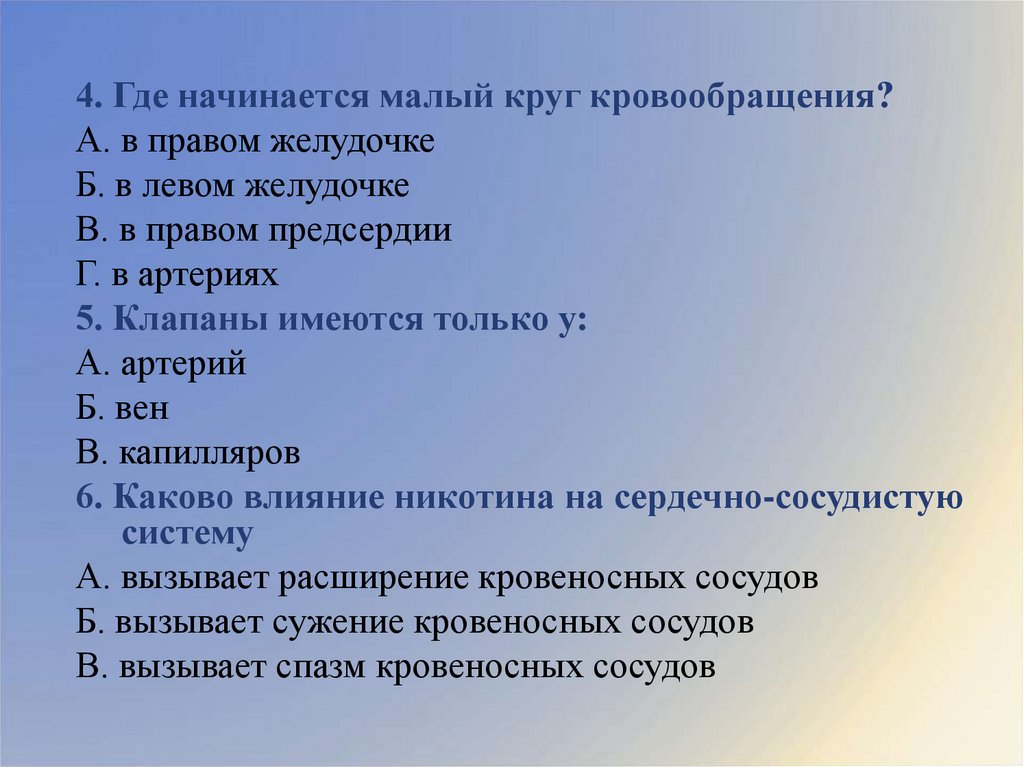 4. Где начинается малый круг кровообращения?А. в правом желудочке