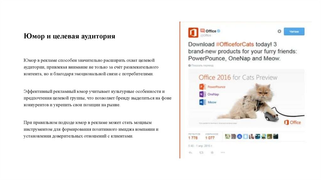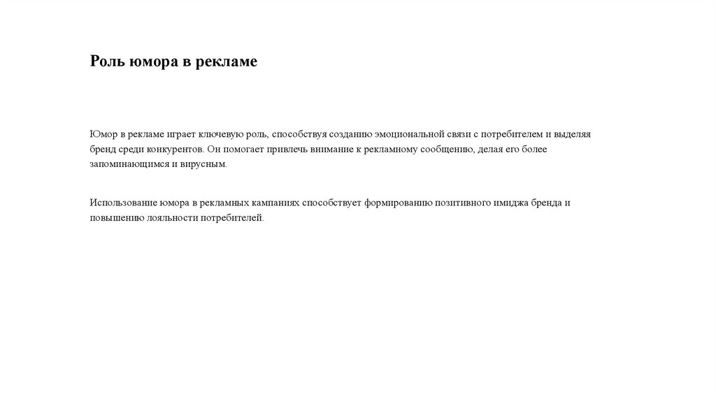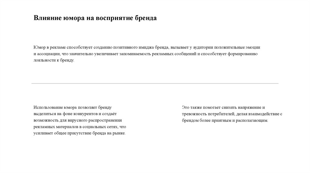 Влияние юмора на восприятие брендаЮмор в рекламе способствует созданию позитивного имиджа бренда, вызывает у аудитории положительные эмоции