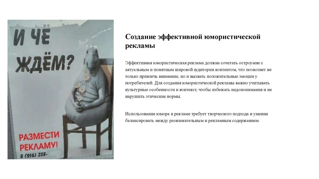 Роль юмора в рекламеЮмор в рекламе играет ключевую роль, способствуя созданию эмоциональной связи с потребителем и выделяя