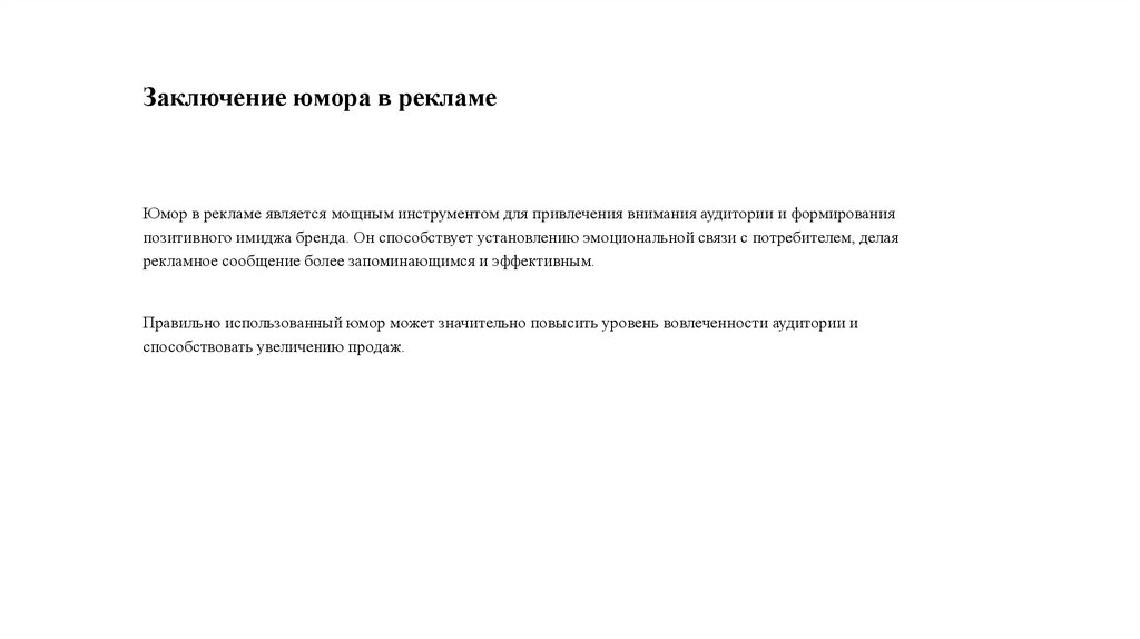 Заключение юмора в рекламеЮмор в рекламе является мощным инструментом для привлечения внимания аудитории и формирования