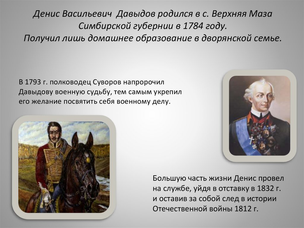 Денис Васильевич Давыдов родился в с. Верхняя МазаСимбирской губернии в 1784 году.